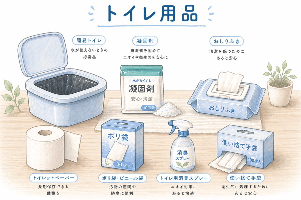 - 簡易トイレ本体:組み立て式やポータブル式がある