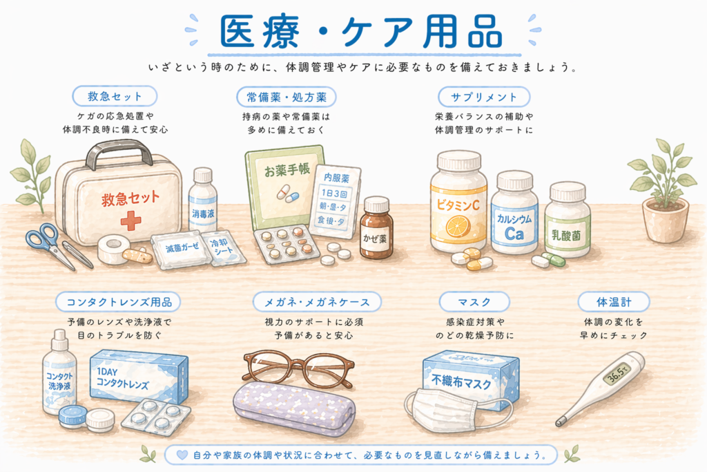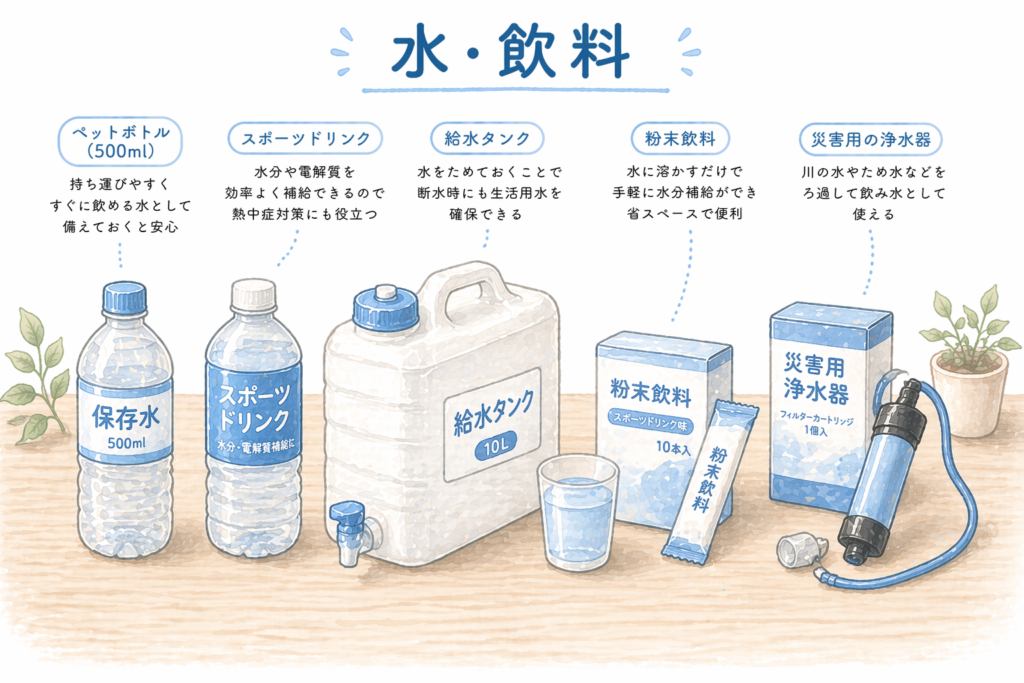 - 飲料水:割り高でも500mlのペットボトルで用意すると使いやすい